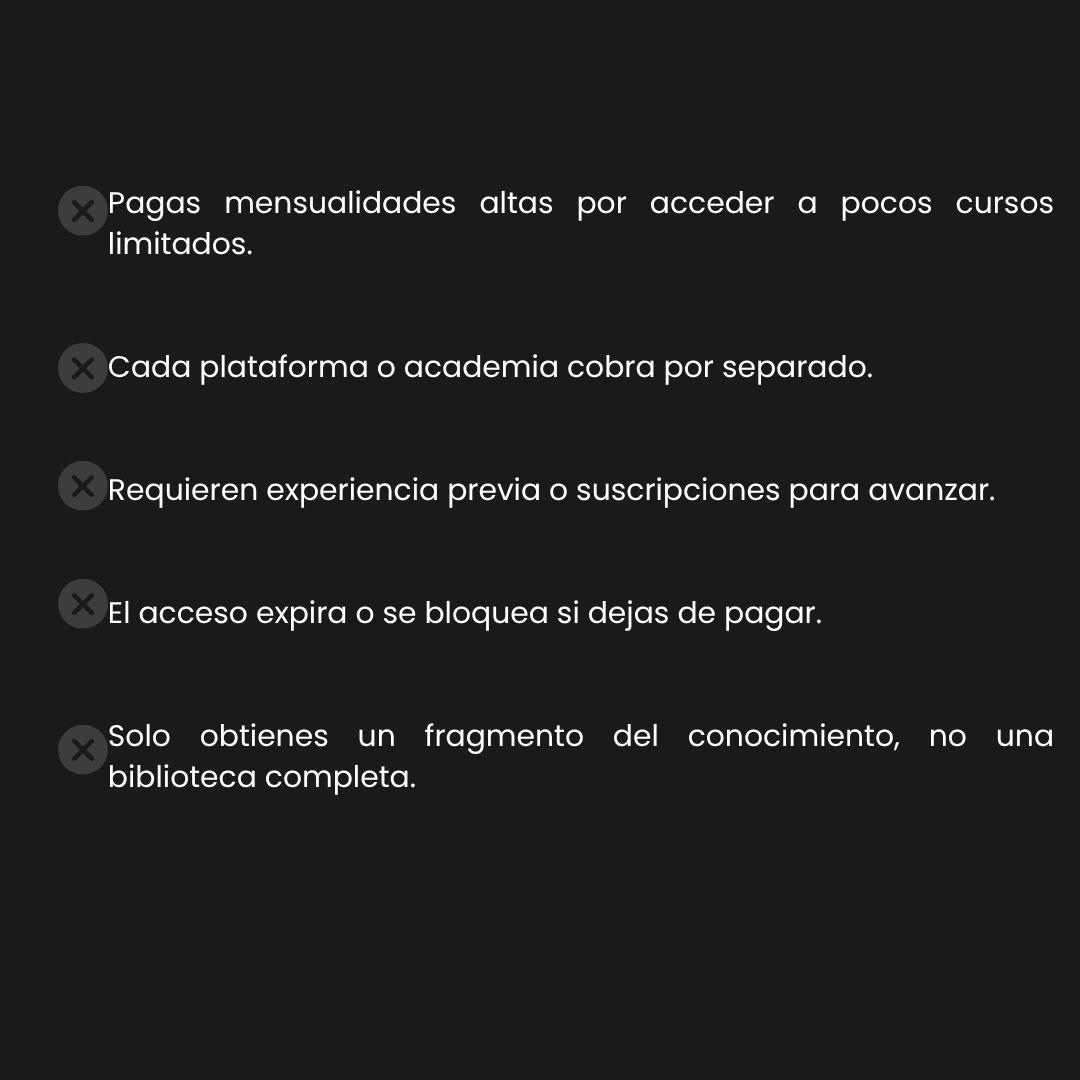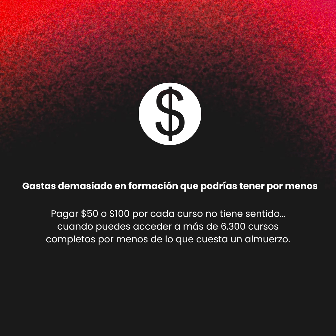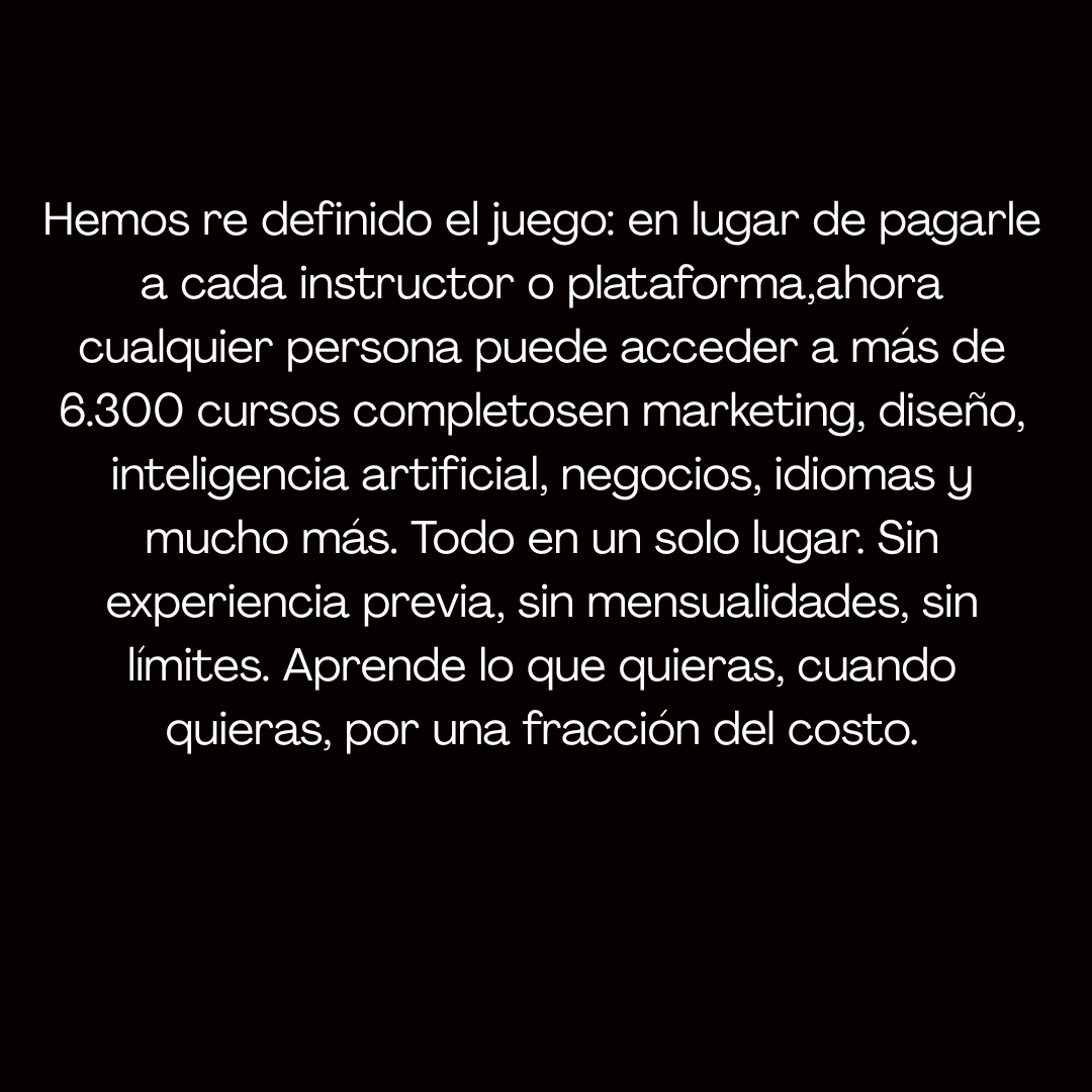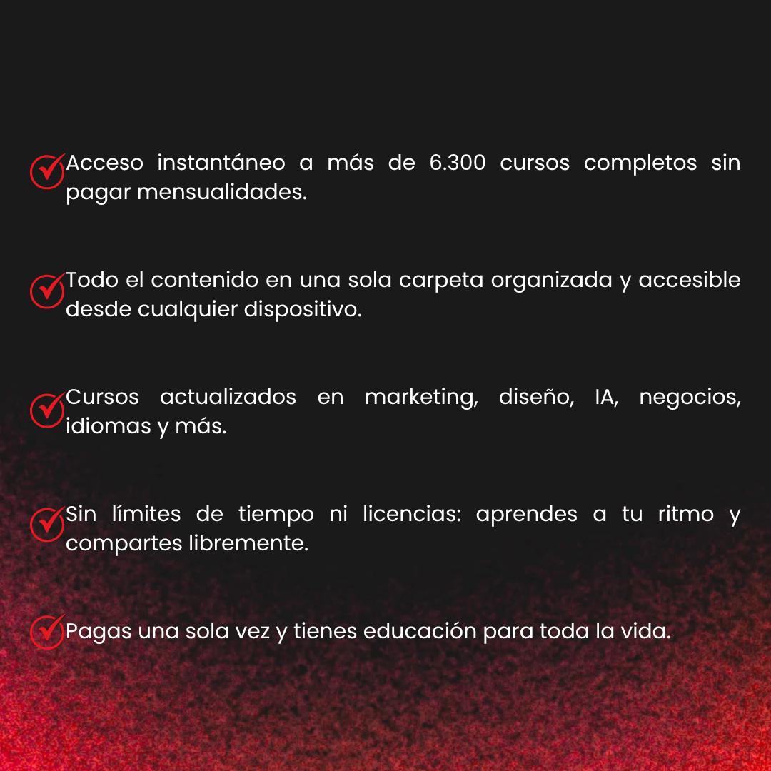 Porque decidimos no guardarnos nada. Reunimos más de 6.300 cursos completos en un solo lugar, para que cualquier persona —sin importar su experiencia o presupuesto— tenga acceso al conocimiento que antes solo estaba reservado para unos pocos.